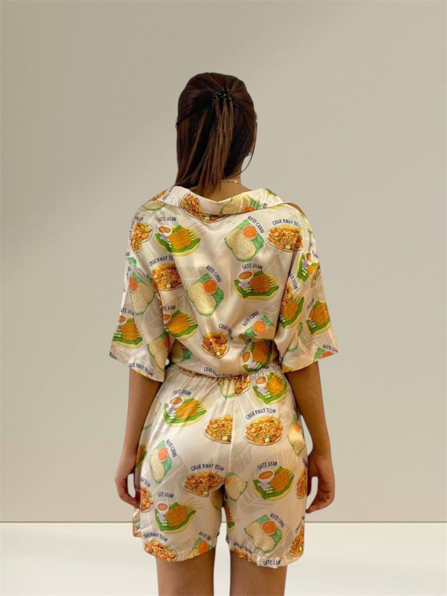 Malaysian Food Hawaiian Shirt Craving some style? Feast your eyes on our Malaysian Food Hawaiian Shirt! Crafted from ultra-smooth, high-quality satin fabric, this shirt offers exceptional comfort with a glossy, stylish finish that feels fantastic against your skin. Featuring a mouthwatering all-over print of iconic Malaysian dishes like Nasi Lemak, Char Kuey Teow, and Satay Ayam artfully scattered on a soft cream background, this shirt brings a delicious touch of local culinary culture to your wardrobe. The vibrant depictions of these beloved meals create a visually appetizing and unique look that's sure to spark conversations about your favorite eats. Material: Soft, and breathable fabric Design: All-over print of popular Malaysian dishes Feel: Lightweight, silky, and undeniably delectable Whether you're a local with a deep appreciation for Malaysian food or simply someone who enjoys a unique and eye-catching design, this shirt offers the perfect blend of comfort and flavorful visual appeal. IMPORTANT NOTE: The item may appear slightly different from the pictures shown due to studio lighting conditions and variations in device screen color calibration.