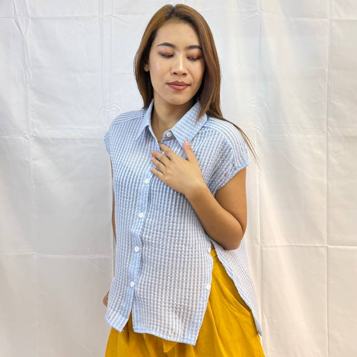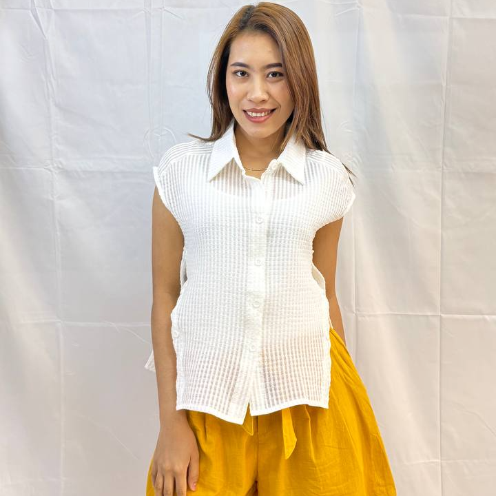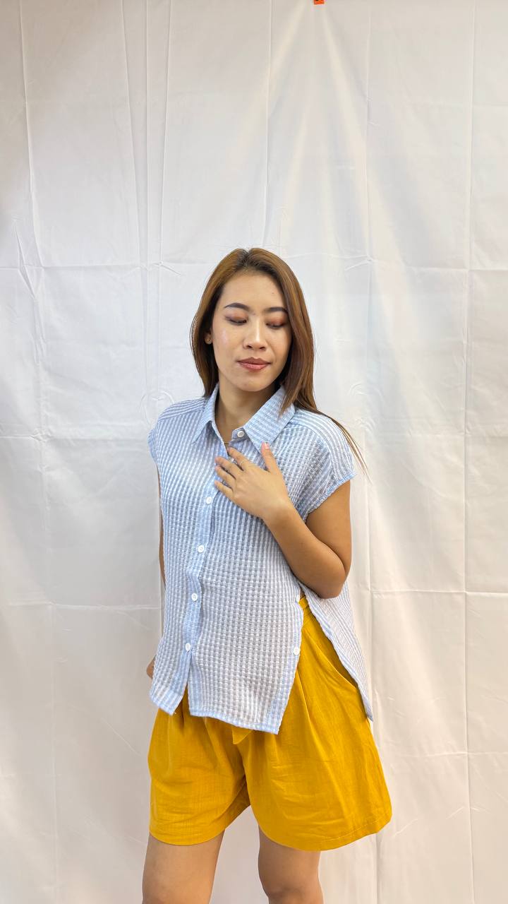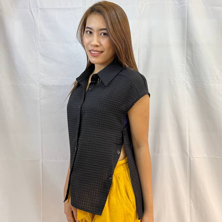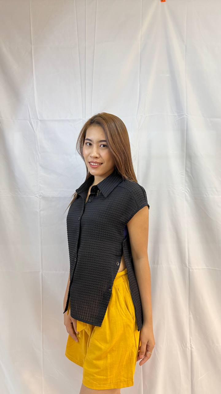 The split textured top is a lightweight, textured button-down designed with clean side splits for effortless movement. The structured woven pattern adds a subtle dimension, while the relaxed silhouette keeps it comfortable and versatile. Perfect for pairing with shorts or trousers. This top blends minimal style with a modern edge. Measurements: Bust: 90cm Waist: 110cm (adjustable) Length: 67cm